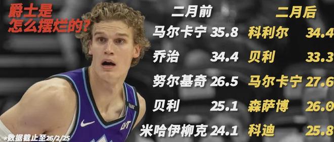 2月份前,爵士出场时间最多的人是——马尔卡宁、猪猪侠乔治、努尔基奇、贝利、米哈伊柳克。