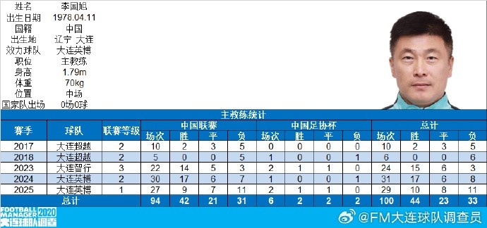 100场执教当中,李国旭带队取得44胜23平33负的成绩,其中执教大连超越16场,2胜3平11负;执教大连英博(含大连智行)84场,42胜20平22负。